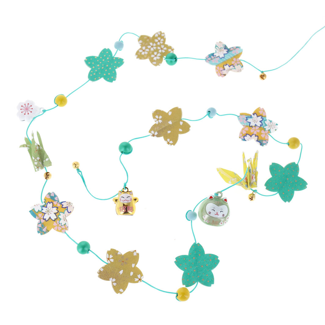 ainsi que 2 petit carrés de papier japonais, dans les tons vert amande et jaune citron de 6cm de côté, offerts si vous souhaitez ajouter deux pliages à votre guirlande.
