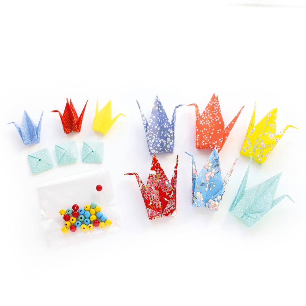 - 1 manuel principal avec le pliage des petits carrés et de la grue, la réalisation des six petites guirlandes et le montage du mobile