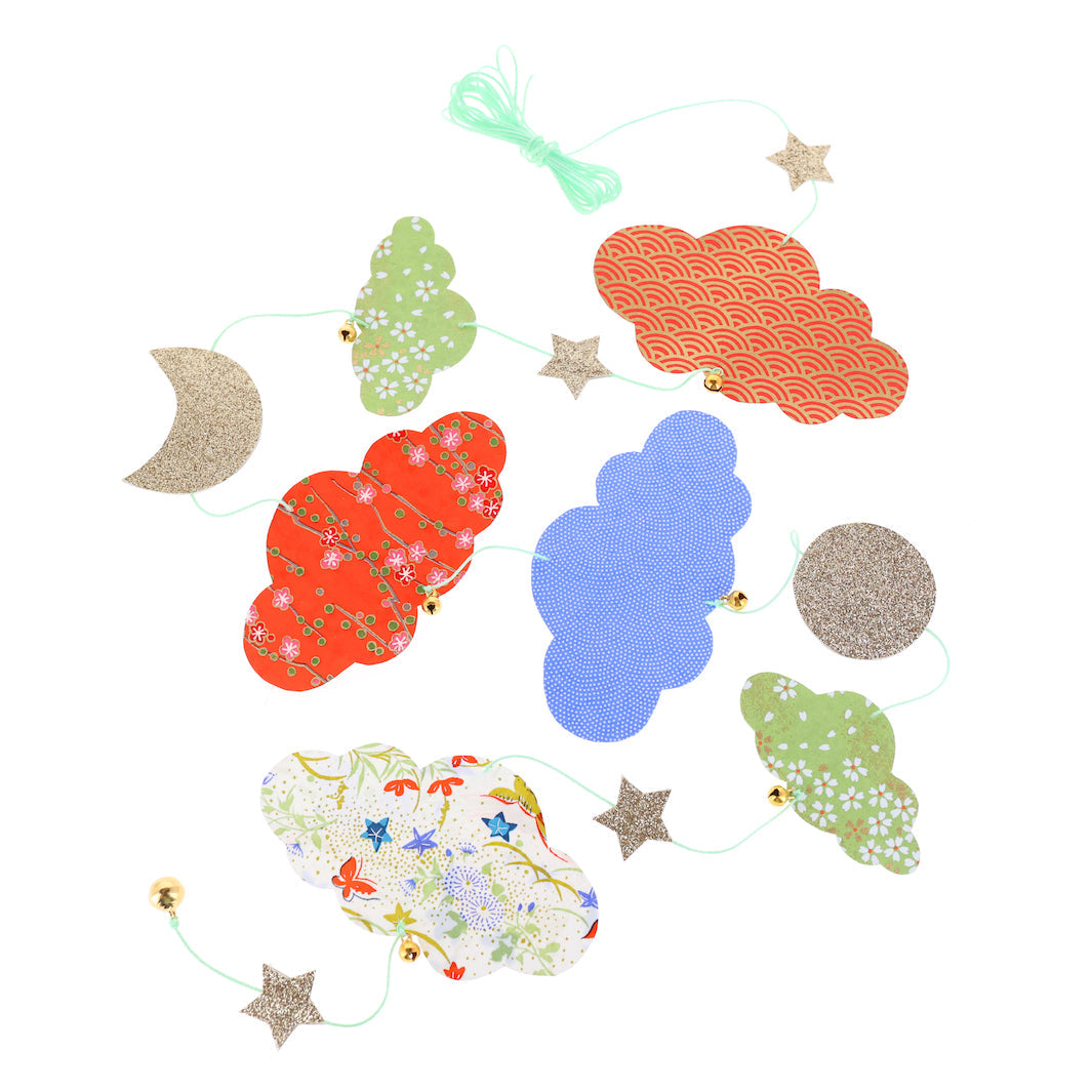 Ce joli kit créatif contient les explications et fournitures nécessaires à la réalisation d'une guirlande de 5 nuages en papier japonais dans les tons rouge orangé, vert amande, bleu pervenche et blanc crème !