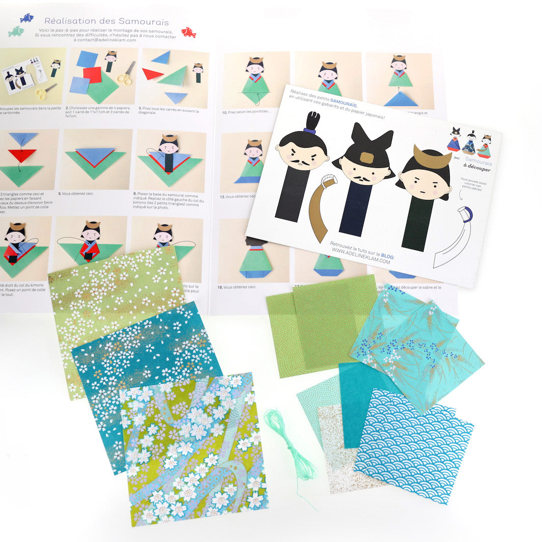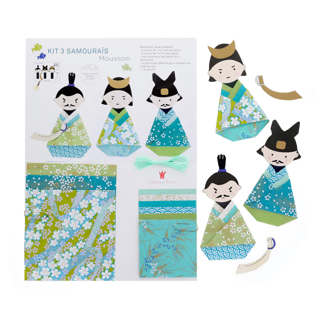 Cet adorable kit créatif contient toutes les explications et le matériel nécessaire pour apprendre à réaliser trois petits samouraï, habillées de kimono en origami, dans les tons vert d'eau, bleu turquoise et verts.