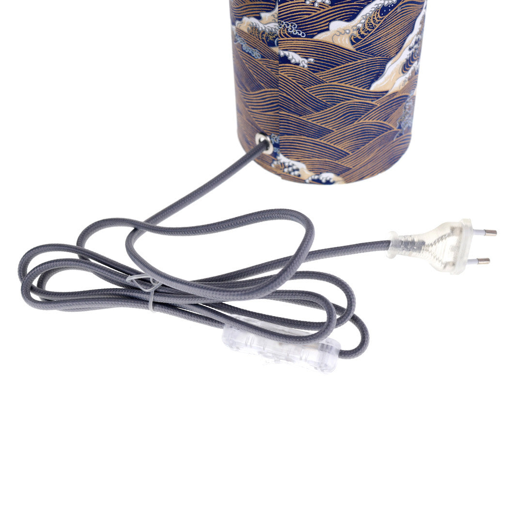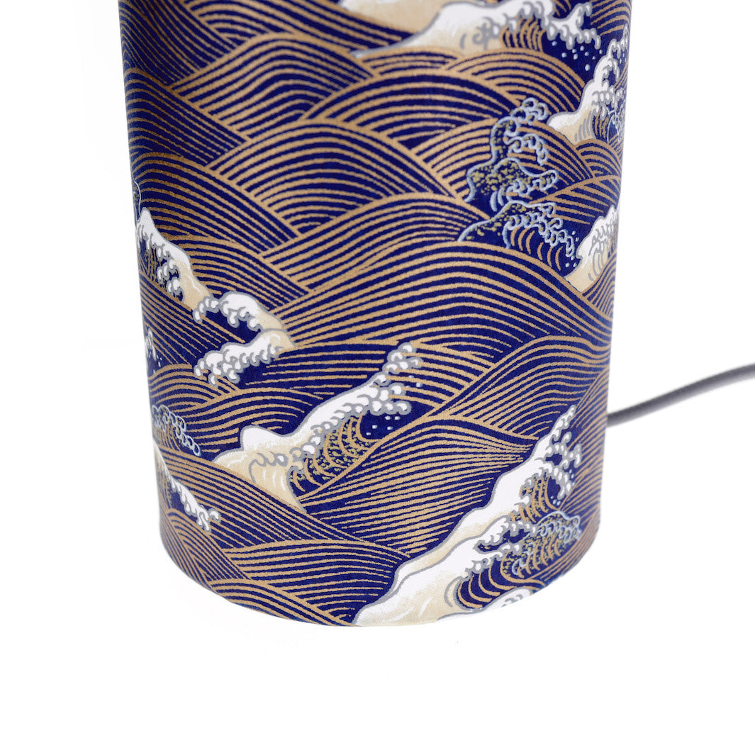 Cette élégante lampe japonaise à poser est aux motifs de vagues dorés et écumes blanches et beiges et détails gris sur fond bleu nuit.