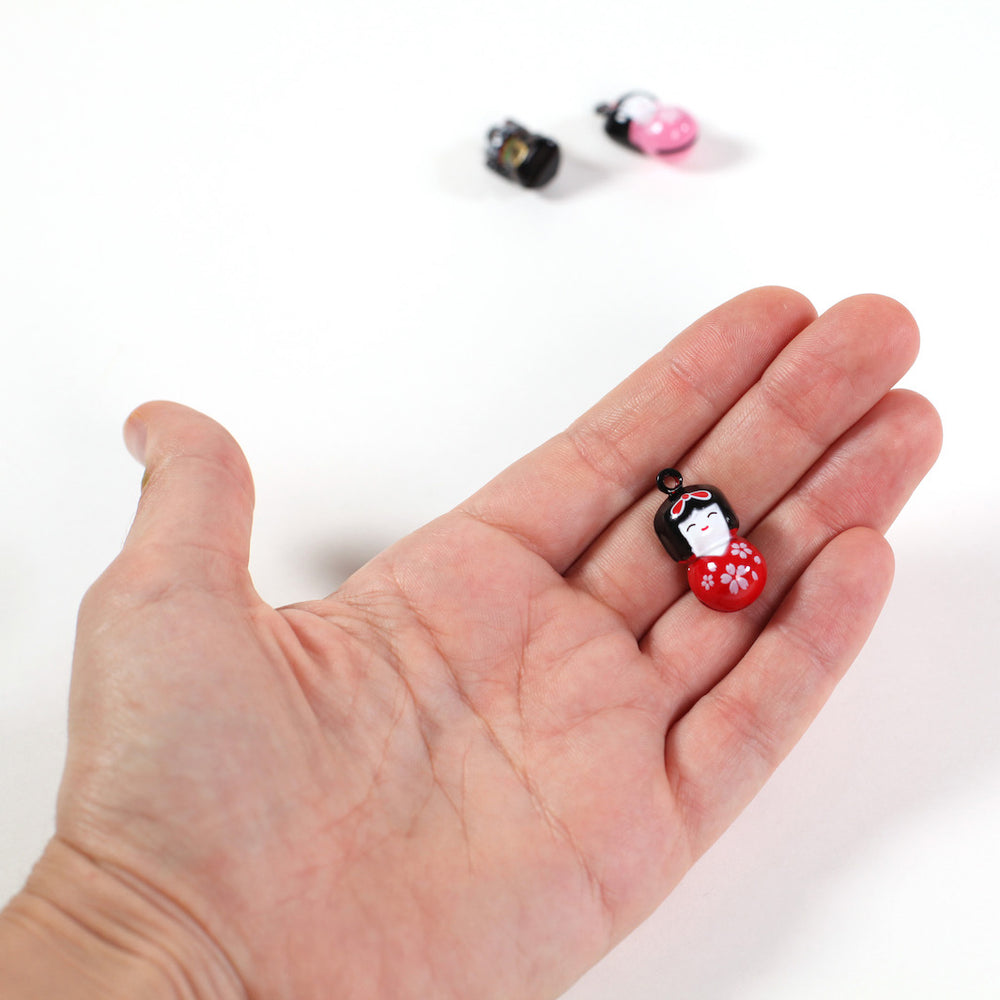 Adorable petit grelot en forme de kokeshi rouge aux détails blancs, rouges et noirs.
