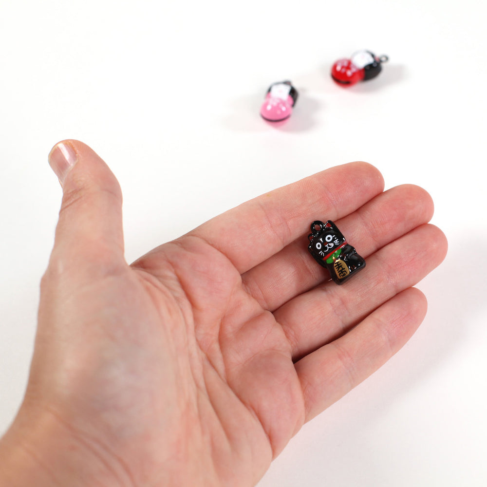 Adorable petit grelot en forme de maneki-neko noir aux détails blancs, rouges, verts et dorés.