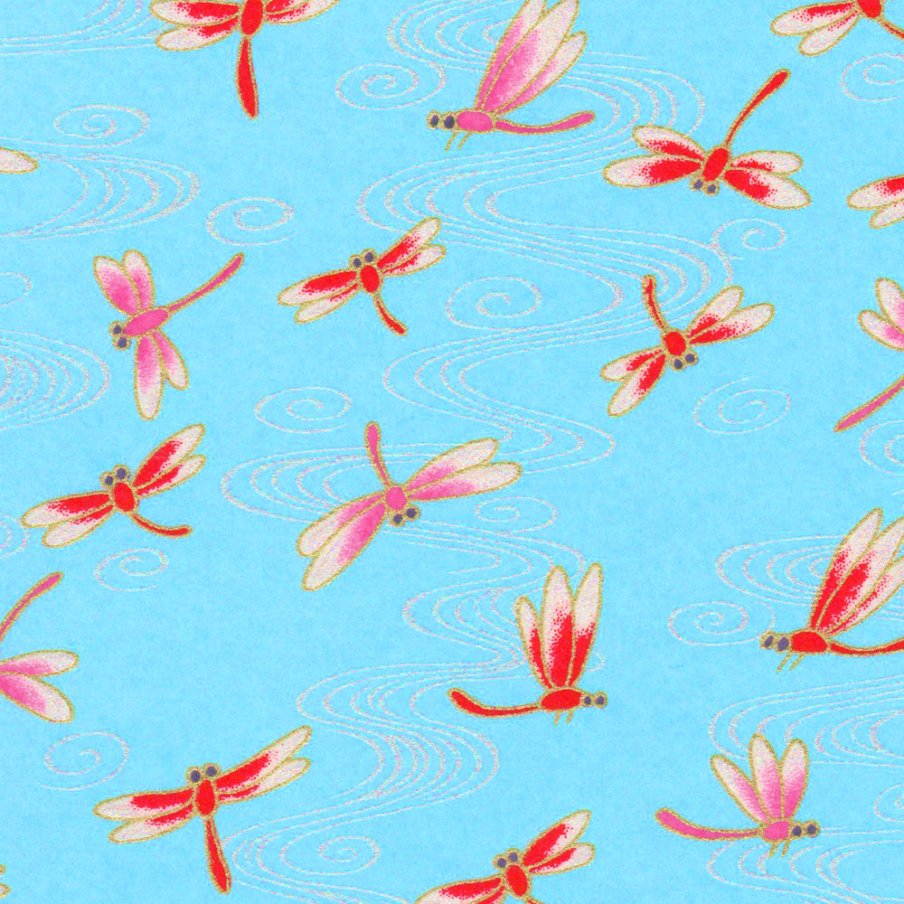 - Papier à Libellules (tonbo) rouges et roses aux détails dorés, ondulations de l'eau blanches sur fond bleu
