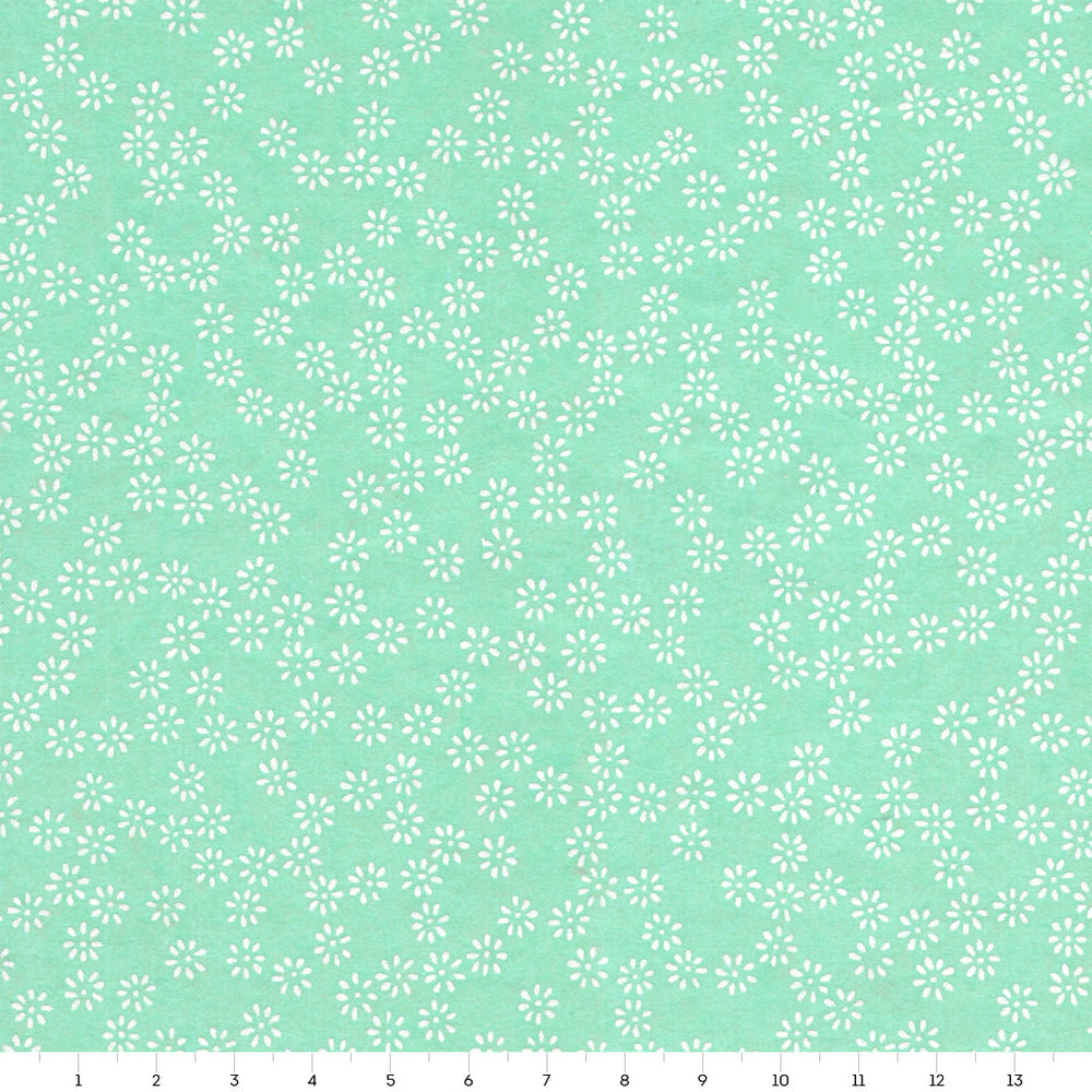 Ce joli papier japonais, imprimé par sérigraphie, est aux motifs de petites fleurs blanches sur fond vert d'eau.